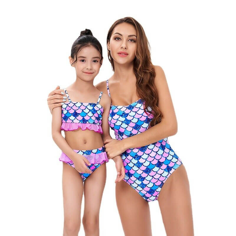 Ten dopasowany strój kąpielowy pięknie podkreśli mamę i córkę. Pokochacie niebiesko-różowe łuski!